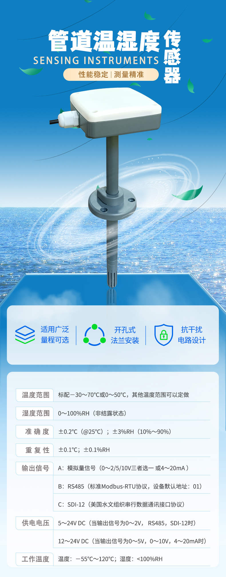 供电电压:5~24V DC(当输出信号为0~2V,RS485,SDI-12时)