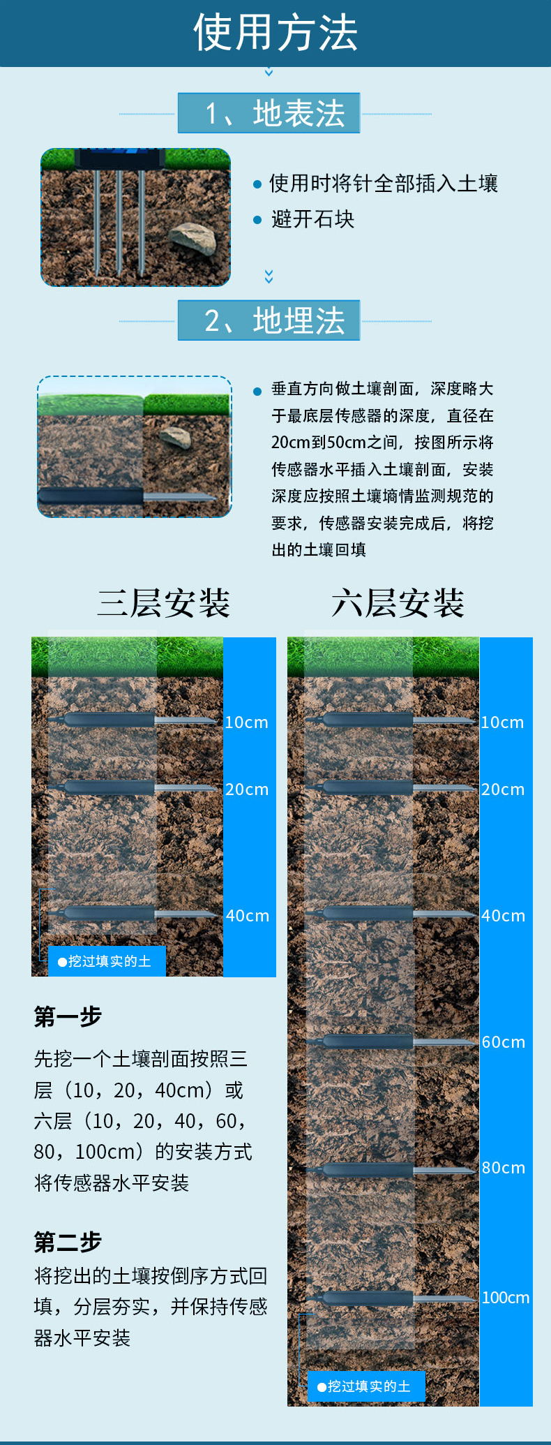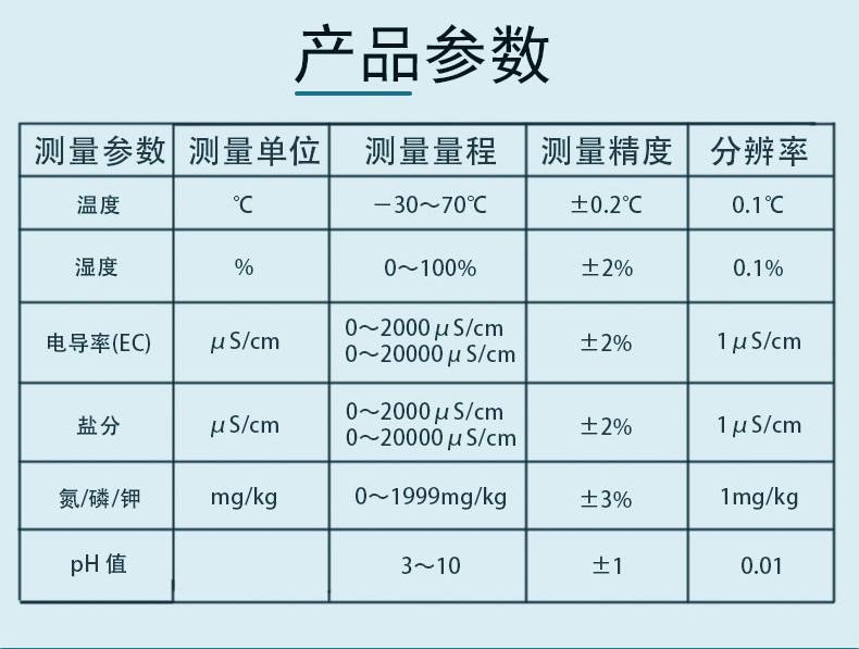 测量参数:土壤温度,土壤容积含水率,土壤盐分,土壤氮/磷/钾。
