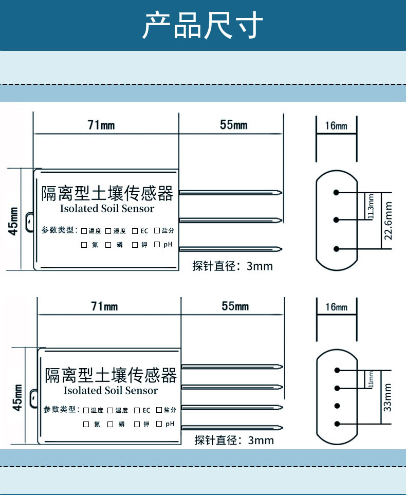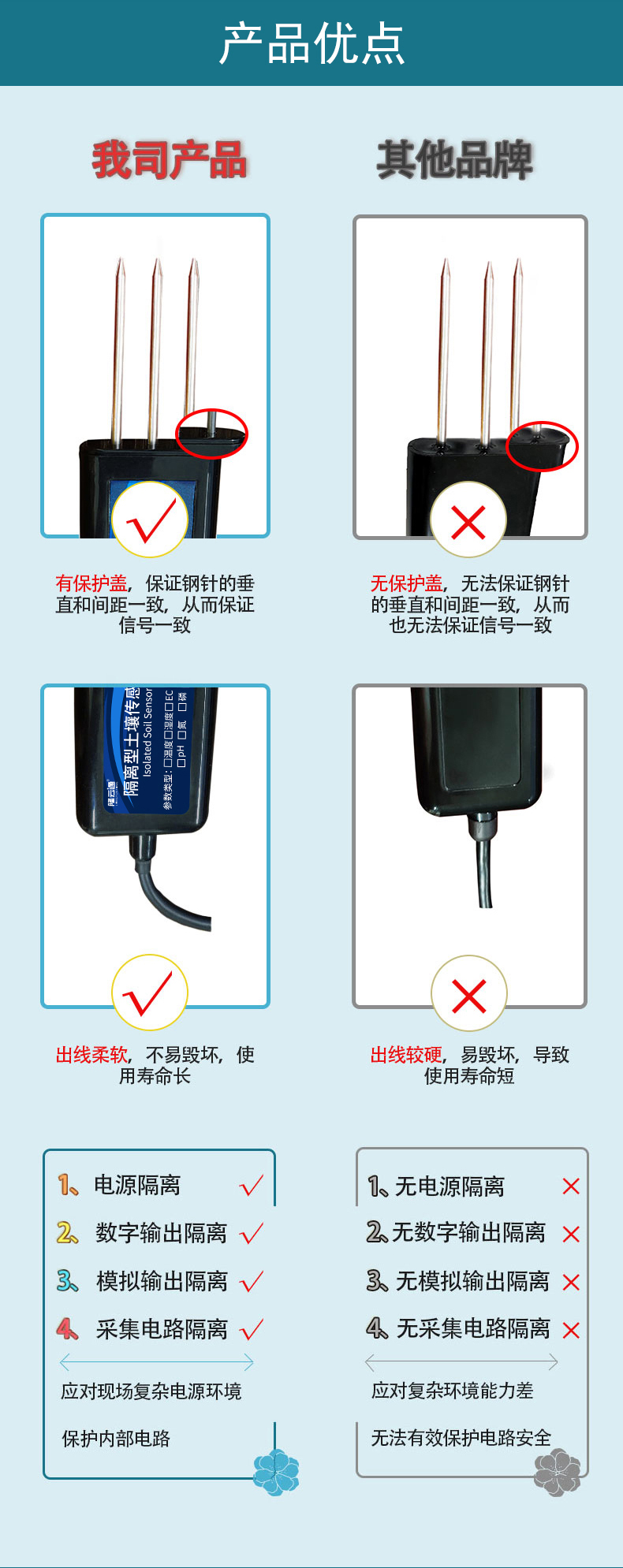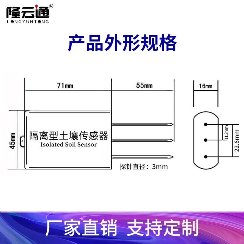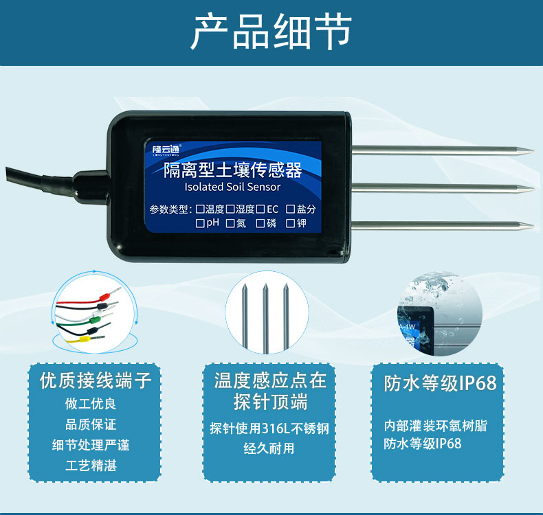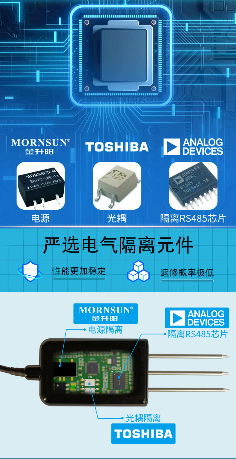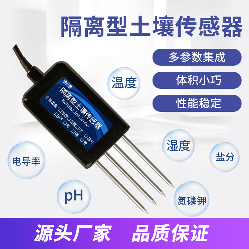 隔离型土壤温度部分是由进口NTC精密电阻和高精度传感器两部分组成。传感器部分由电源模块、温度传感模块、变送模块、温度补偿模块及数据处理模块等组成,彻底解决热敏电阻因自身特点导入的测量误差,传感器内有零漂电路和温度补偿电路,对使用环境有较高的适应性。