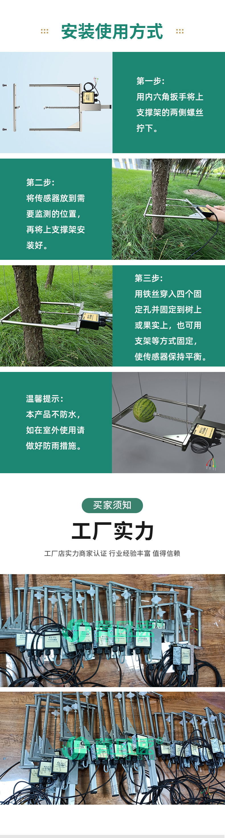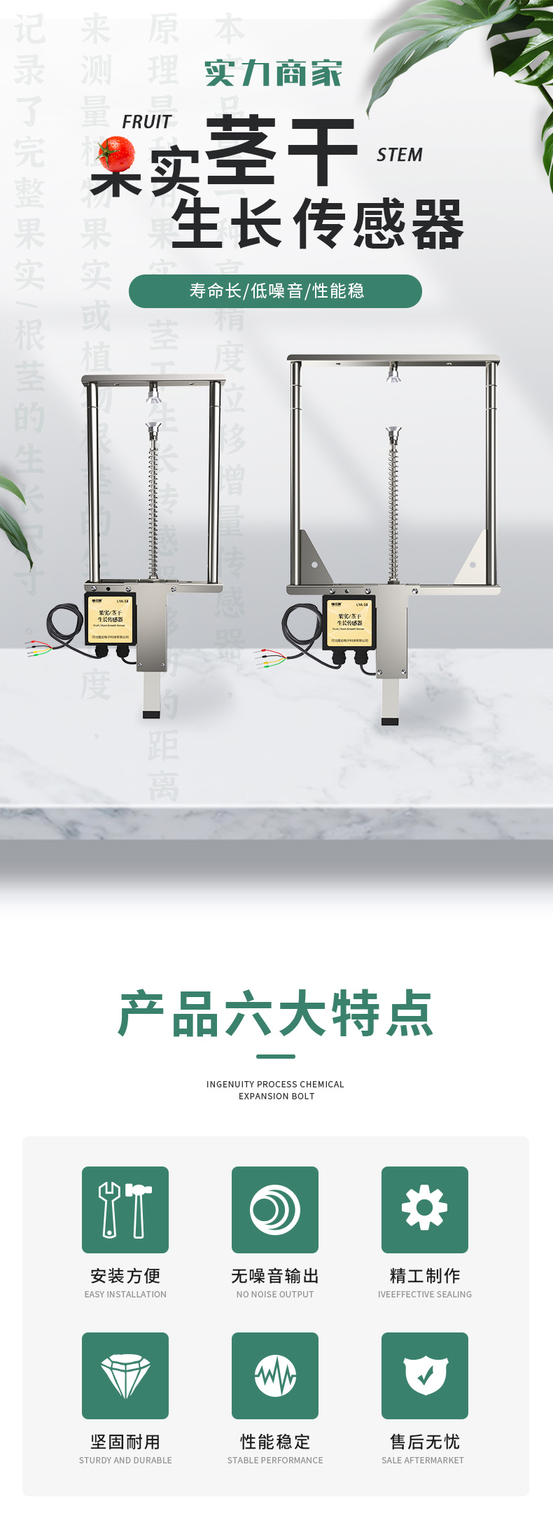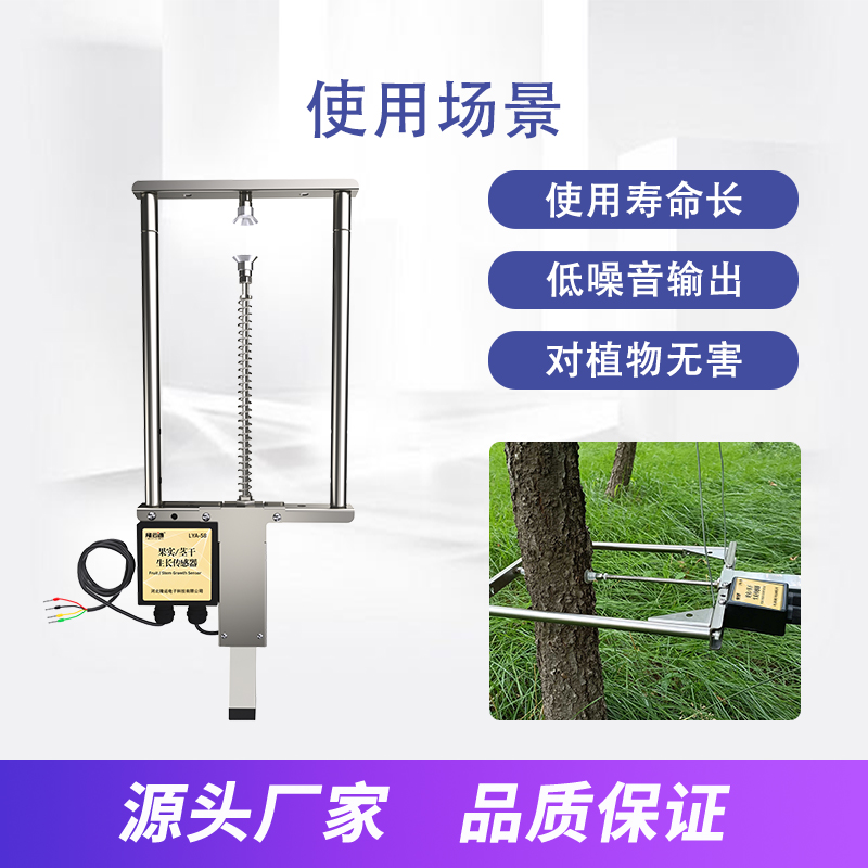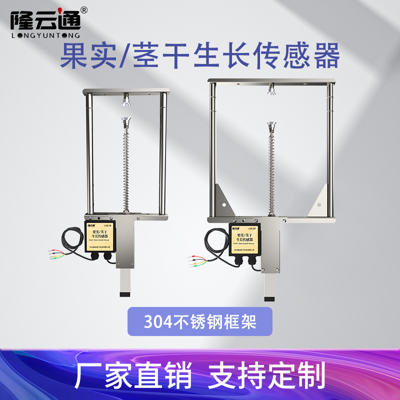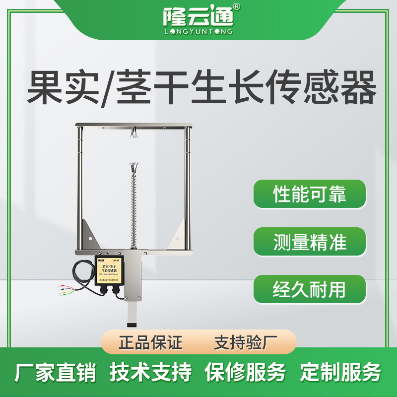 果实茎干传感器是一种高精度位移增量传感器,测量原理为利用高精度的位移传感器移动的距离来测量植物果实或植物茎秆的生长变化长度。可记录水果或者植物茎秆整个生长周期的大小变化。广泛适用于国家科研课题、现代农场、气象系统、自动灌溉灌溉等需要测量植物果实或植物茎秆生长长度的生产和科研领域。