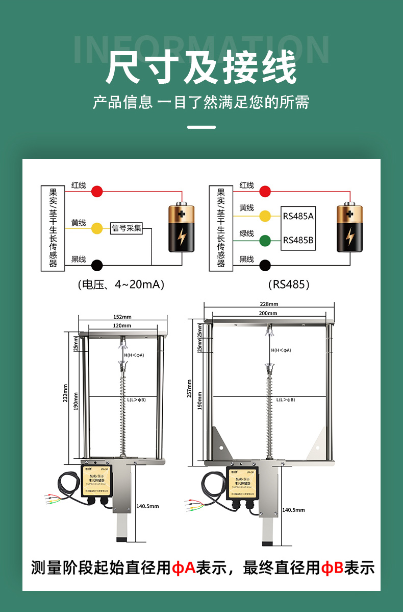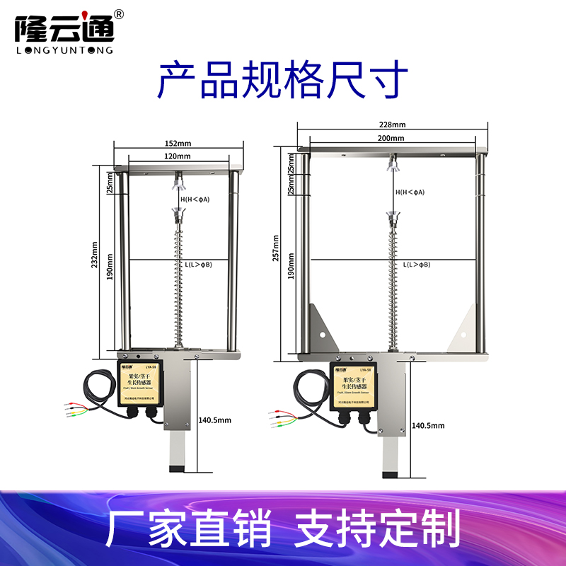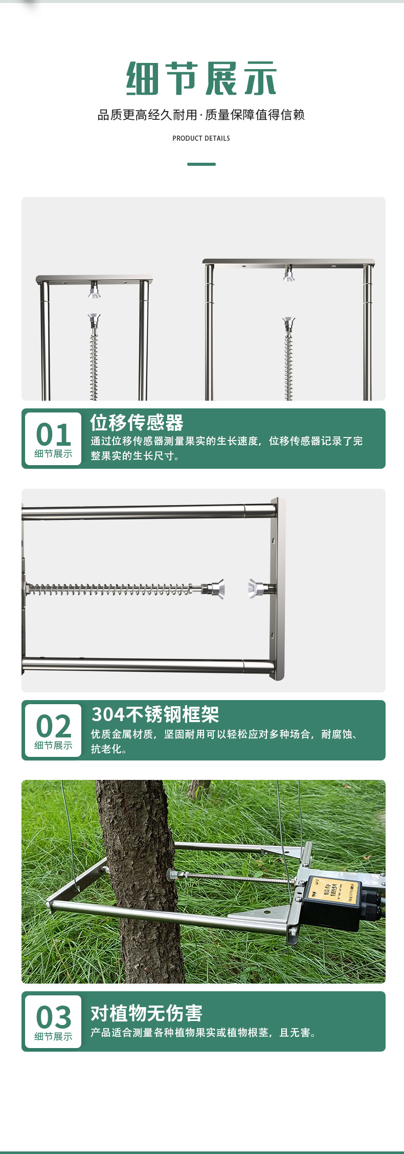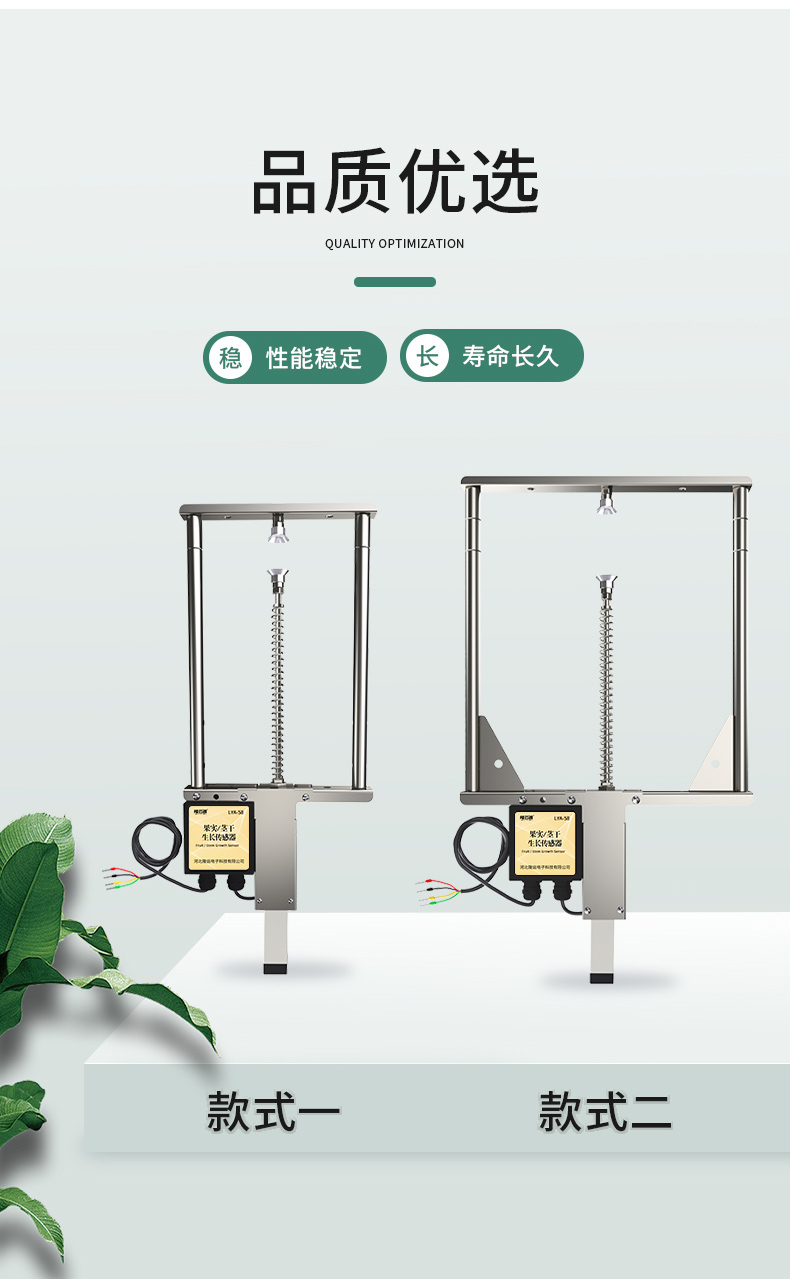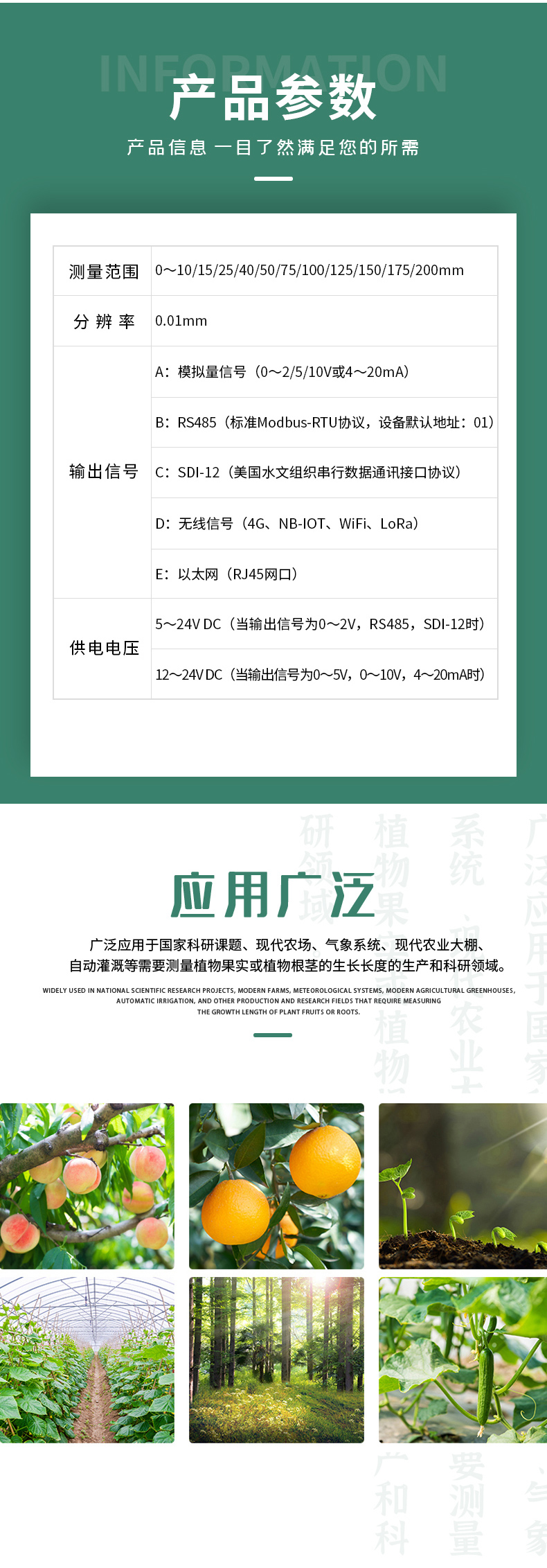 果实茎干传感器是一种高精度位移增量传感器,测量原理为利用高精度的位移传感器移动的距离来测量植物果实或植物茎秆的生长变化长度。可记录水果或者植物茎秆整个生长周期的大小变化。广泛适用于国家科研课题、现代农场、气象系统、自动灌溉灌溉等需要测量植物果实或植物茎秆生长长度的生产和科研领域。